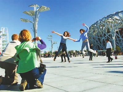 7月26日,又是一个普通的周末,从江苏常州前来北京旅游的王建业一家在“鸟巢”旁边流连忘返,尽情享受着出游的愉悦,“去年没能到现场来看奥运会,现在能到‘鸟巢’留张影,也算弥补了一下心中的遗憾”。作为北京奥运会的标志性建筑之一,“鸟巢”、“水立方”等奥运场馆和故宫、长城、人民大会堂、中华世纪坛等建筑一样,见证着北京迈向国际现代化大都市的进程。
