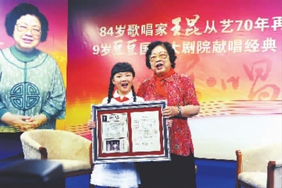 84岁的著名歌唱家王昆7月30日在北京收下了9岁的豆豆为“关门弟子”,这位延安时期的老演员已经从事革命文艺工作70年了。“花篮的花儿香,听我来唱一唱,来到了南泥湾,南泥湾好地方……”随着熟悉的旋律响起,她们共同演唱这首《南泥湾》,一老一少将南泥湾精神代代相传。本报记者 许之丰 摄