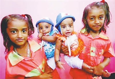 印度喀拉拉邦小村考丁基可以说是世界上双胞胎比例最高的村子。该“双胞胎村”的2000户家庭中至少有204对双胞胎。图为7月29日,一户家庭的两对双胞胎姐妹合影。阿健 供图
