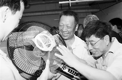 7月21日,脸上满是笑容的3位特困职工在安装刚刚领到的落地电风扇。连日来,高温天气肆虐石家庄市。当日,石家庄市正定县总工会“为困难职工送礼——落地电风扇吹走‘三伏天’”活动展开,24名特困职工和58名低保边缘职工将得到总价值16400元的电风扇和凉席。据了解,正定县总工会每年拿出10万元用于帮扶困难职工。郑荣玺摄