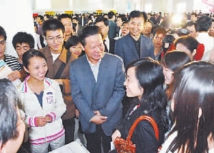 2008年10月24日,湖北省委常委、省总工会主席张昌尔,省总工会党组书记、常务副主席黄国庆与参加就业帮扶招聘会的求职者亲切交谈。