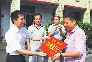 黄石市委常委、市总工会主席陈金刚(左一)为黄石矿务局职工送清凉