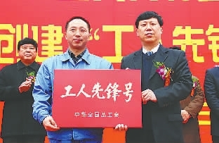 东风公司工会主席叶惠成(右)给获得全国“工人先锋号”称号的东风商用车公司总装配厂“王涛班”授牌
