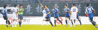 8月2日,大连实德队球员庆祝进球。当日,在中超联赛第16轮比赛中,大连实德队主场1比1战平天津泰达队。