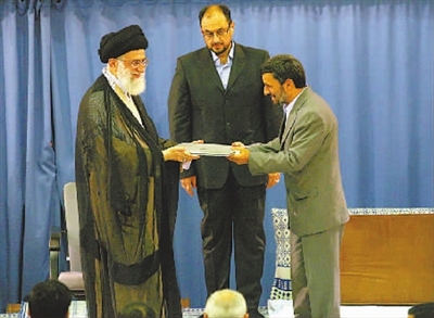 8月3日,在伊朗首都德黑兰,伊朗最高领袖哈梅内伊正式批准艾哈迈迪-内贾德为伊朗第10届总统。这是哈梅内伊(左)当天向艾哈迈迪-内贾德(右)颁发总统委任函。