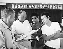 近日,河南修武县建委投资万余元,分批分期对全县21个重点在建工程的3200余名农民工进行了建筑工地安全生产知识、技能教育培训。图为培训期间农民工们正在交流教育培训体会。