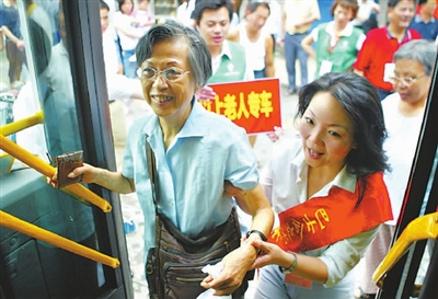 8月5日,公交人员帮助一位老人登上刚开通的“公交老人专车”。当日,上海大众西北公交三公司224路开通“公交老人专车”,专供70岁以上老人乘坐,以提高老年人乘车的安全性和舒适度。专车每周一至周五上午9点开通一趟,车上配有常用药、针线包等。陈焕联 摄