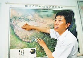 2009年7月15日,国测一大队队长岳建利在中国卫星影像图上标示正在野外作业队伍的位置。新华社记者 杨光 摄