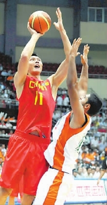 今天比赛一开始,中国队就打了对手一个7比0,在易建联和王治郅两位高大球员的防守下,印度队的队员难以打进内线去,只能在外线频频投三分,但整场比赛,印度队的三分球23投仅3中,两分投篮55投仅中15个。反观中国队,三分球28投18中,命中率高达64%,而且也打破了中国队单场三分球纪录。两分球33投19中,命中率也接近60%。印度队全场比赛仅有3人得分上双,最高得分为14分。中国队则有6名球员得分上双,胡雪峰、易建联和苏伟三名球员都得到16分。中国队的12名球员除了刘炜,11人都有得分,最少为7分。