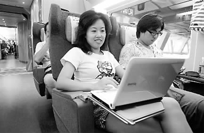 一名女士在京津城际列车上用笔记本电脑工作。新华社记者 李文摄