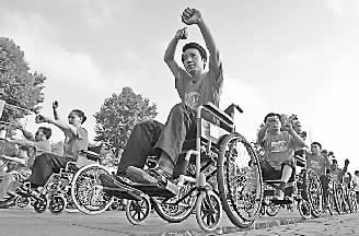 8月8日,在湖北省武汉市庆祝我国首个“全民健身日”活动中,几十名残疾人坐在轮椅上表演太极拳。新华社发(王南飞 摄)