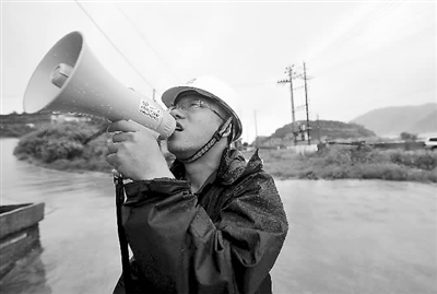 8月8日,浙江苍南的一位民防人员正在用喇叭呼喊滞留在老屋的老人们撤离。