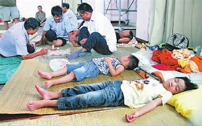 8月9日下午,浙江省温岭市松门镇松门中学安置点,几位安徽籍农民工的孩子安然入睡,而农民工们正在下象棋。当日,松门中学体育馆成为台风转移集中安置点,这里共安置了500多名外来务工人员,他们大部分是该镇两个建筑工地的工人。吴鹏飞 摄
