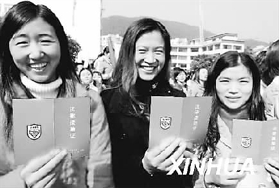 资料图片:在福州务工的江西籍农民工许冬梅(左一)和工友领到“法律援助证”。当日,由福建省司法厅和总工会联合推出的“法律援助证”开始向全省188万农民工发放。持有“法律援助证”的农民工,不用其他证明材料和审核手续,凭证就可向当地工会组织或司法机关申请法律援助。新华社记者 张国俊 摄