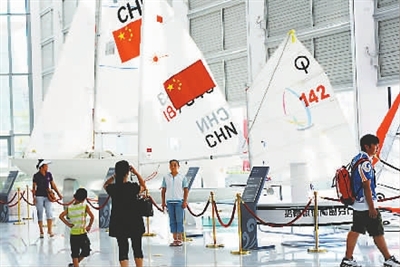 8月9日,观众在青岛奥帆博物馆内参观。当日,青岛市奥林匹克帆船博物馆正式开馆。该馆位于青岛奥帆中心内,展览面积约4000平方米,全景式地展示奥运会帆船比赛的体育与文化价值。