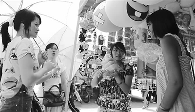 8月9日,大学毕业生郑靖敏(右一)在向顾客介绍商品。