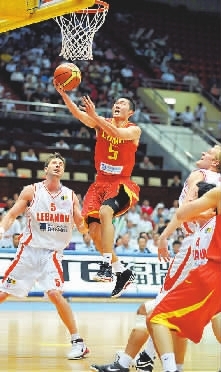 8月11日,中国队球员刘炜(上)在比赛中上篮。当日,在天津进行的第25届亚洲男篮锦标赛中,中国队险胜黎巴嫩队。新华社记者 罗更前 摄
