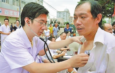 8月12日,浙江省温岭市中西医结合医院医生在石粘村为受灾群众义诊。台风“莫拉克”过后,为预防传染病、皮肤病等相关疾病的发生,该院组织30多名医护人员,走进受灾严重的农村为群众送医送药。周学军 摄