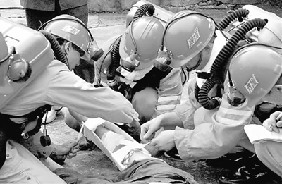 8月12日,在四川华蓥山矿区广能集团李子垭煤矿举行的应急救援演练中,救护队员在给“伤员”包扎伤口。当日,李子垭煤矿举行大型矿山应急救援演练,以提高企业应对突发事故的紧急救援能力,确保矿区平安。邱海鹰 摄