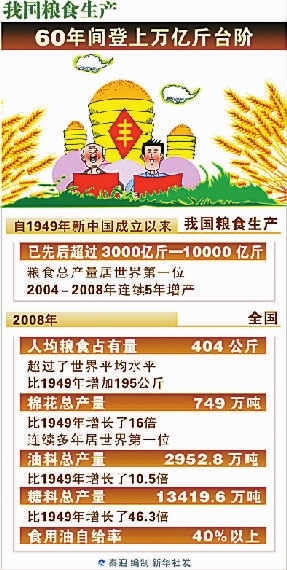 据统计,建国60年来,我国实现了农作物品种5~6次大规模更新换代,推动粮食亩产从1949年的69公斤,提高到目前的330公斤,总产量从1150亿公斤提高到目前的5285亿公斤。