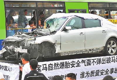 车主孔先生6月发生车祸后,对宝马车的轮胎和安全气囊存在质疑,于是采取了这样的方式想讨个说法。柴魏 摄