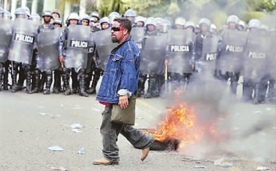11日,在洪都拉斯首都特古西加尔巴,一名参加示威活动的男子走过正在警戒的军警。被罢免总统塞拉亚的数千名支持者当日在洪总统府周边地区举行大规模游行示威,要求临时政府立刻无条件接受塞拉亚回国复职。新华社发(拉斐尔·奥乔亚 摄)