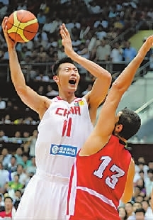 8月12日,中国队球员易建联(左)在比赛中。新华社记者 王晔彪 摄