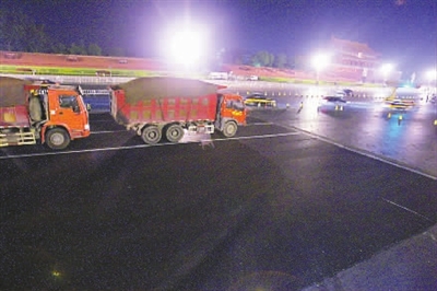 8月13日凌晨,施工人员在北京人民大会堂北侧的长安街上摊铺环保沥青。