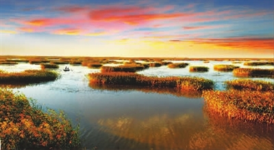 秋天大自然的色彩,在盘锦体现的最多。红、黄、蓝、白随意寻找。盘锦西部世界上最大的连片似海的芦苇荡,是世界自然生长最大的苇田,总面积8万公顷,年产芦苇50万吨。茫茫苇海,浩无边际。在秋天它就是世界上最大的金色芦苇荡。进入芦苇荡可以划船,船穿梭在芦苇荡中,蜿蜒曲折的水道,静静地让游人寻找着芦苇荡水面上鱼儿的脊背,看着野鸭子戏水,忽然会有不知名的大鸟、小鸟飞起,惊讶地用眼睛使劲盯住,看着它飞远了。要在芦苇荡里散步,有栈道架在上面,走在上面只想大口地呼吸,湿地是地球之肾,这里的空气新鲜无比。呼吸清新的空气,解除工作的劳顿和生活的紧张,体验回到自然的感受。