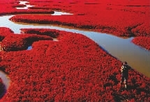 秋天的盘锦红海滩,可看到似浪生火焰的红海滩。红海滩是大自然孕育的一道奇观。织就红海滩的是一棵棵纤弱的碱蓬草,她每年4月长出地面,初为嫩红,逐渐转深,10月由红变紫。一簇簇,一蓬蓬,在盐碱卤渍里,酿造出一片片火红的生命色泽。有外国人看了红海滩,比喻它是中国红,中国的吉祥色。
