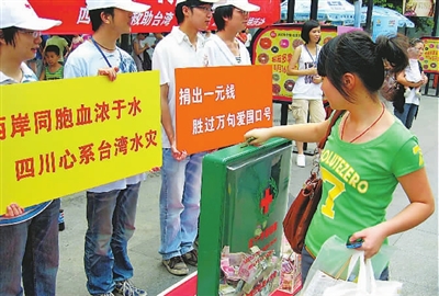 8月16日,四川成都。街头许多过往群众为台湾灾区募捐。余坪 摄
