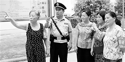 图为武汉市东西湖区公安分局常青花园派出所社区民警与社区治安志愿者在社区内交流社区治安巡防体会和经验。