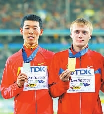 8月15日,金牌获得者俄罗斯选手波尔钦(右)、银牌获得者中国选手王浩(左)在领奖台上。当日,第12届世界田径锦标赛在德国首都柏林开幕。王浩以1小时19分06秒的成绩获得男子20公里竞走银牌。新华社记者 武巍 摄