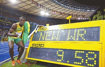 8月16日,牙买加名将博尔特赛后与他创造的新世界纪录合影。当日,在德国柏林进行的田径世锦赛男子100米决赛中,博尔特以9秒58的成绩打破了由他自己保持的原世界纪录,并夺得冠军。新华社记者 廖宇杰 摄