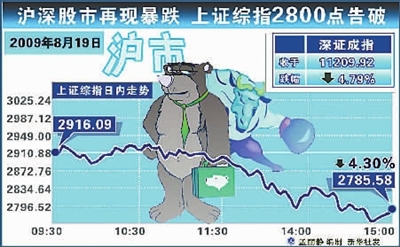 本报北京8月19日电 (记者董沛)今日,沪指失守2800点,金融、地产、电力等权重股全线下挫,两市个股再现普跌。在过去十几天内,中国股市骤跌了约两成。