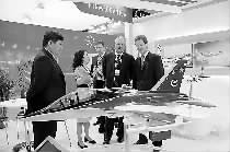 8月18日,在俄罗斯茹科夫斯基市举行的国际航空航天展上,观众在中国航空工业集团公司展台观看L-15“猎鹰”高级教练机模型。当日,2009年俄罗斯国际航空航天展览会在这里开幕。