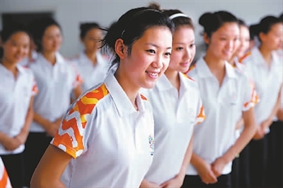 近日,十一运会颁奖礼仪志愿者在青岛进行集中培训。此次培训大纲完全按照奥运标准进行,内容包括形体训练、化妆、颁奖礼仪流程、拓展训练、赛事知识培训等。新华社记者 李紫恒 摄