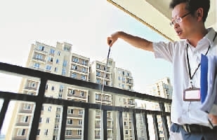 8月19日,杭州市建设工程质量安全监督总站的工作人员为经适房做体检(宝时摄)。近日,杭州市开始对经济适用房住房质量进行为期一个月的专项整治。在此之前,杭州市蓝桥名苑小区经济适用房,一期工程800多套房子已经交付,但是其中有500多户业主要求维修。这些房子存在空鼓裂缝、楼顶渗水等11处质量问题。对在检查中发现的违法违规行为,将按相关法律法规予以严肃处理。