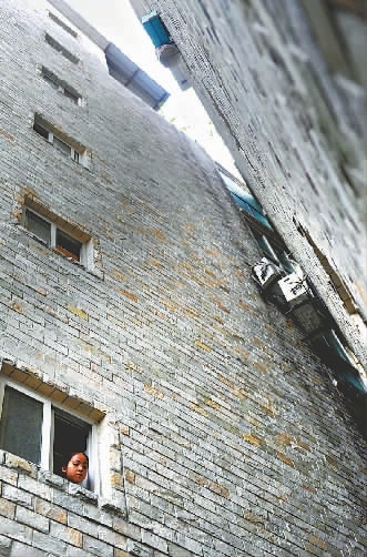7月22日,成都,两幢楼紧挨在一起,居民担心有一天会垮(雷远东摄)。7月17日成都大雨后,“校园春天”小区靠近“德馨苑”工地的7、8、9单元的房屋出现倾斜,路面、围墙开裂。经过分析,业主们认为是隔壁“德馨苑”小区开挖基坑,影响了“校园春天”小区楼房的稳定性。事发后,“德馨苑”项目施工方曾经委托西南勘察院对此进行安全鉴定,鉴定结果反而认为主要是“校园春天”小区自己没有把排水工作做到位。虽然事后“德馨苑”已停止施工,并多次对该小区路面、围墙用水泥和沥青填补,但事态依然没有得到很好的控制。目前双方仍在僵持。