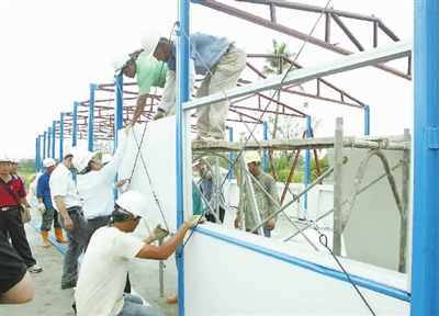 8月20日,大陆援助台湾台风“莫拉克”灾区的首批活动板房已运抵受灾严重的屏东县佳冬乡,当地工作人员已开始试装工作。