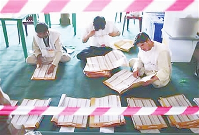 阿富汗选举计票工作从20日开始。图为21日在首都喀布尔一个投票站,选举工作人员正在清点选票。 肖劼 供图