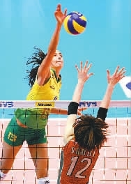 8月23日,巴西队球员卡斯特罗(左)在比赛中扣球。当日,在日本东京举行的2009年世界女排大奖赛总决赛最后一轮的比赛中,巴西队以3比1战胜东道主日本队,从而以五战全胜的战绩夺得冠军。新华社记者 任正来 摄