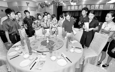 8月19日,在安徽省肥西县“迎国庆·巾帼餐饮服务技能大赛”现场,评委进行现场评分。当日,“迎国庆·巾帼餐饮服务技能大赛”开赛,来自全县28家餐饮服务业近70名服务人员参加了中式摆台、斟酒、托盘等技能比赛。此次活动旨在提高餐饮业女职工队伍的整体素质,激发服务人员学技术、钻业务、练本领、立足岗位成才的热情,培养更多的餐饮服务业技能型人才。徐勇 摄