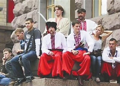 8月24日,乌克兰首都基辅举行活动,庆祝独立18周年。图为一些群众和身着乌克兰传统绣花服装的演员们坐在街边看游行队伍通过。1991年8月24日,乌克兰政府发表国家独立宣言,正式宣布脱离前苏联独立。谢涛 供图