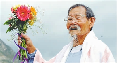 8月25日,今年76岁的孙天恩老人举花庆祝跑完21公里马拉松比赛。当日,第四届拉萨国际半程马拉松挑战赛在拉萨举行,来自全国的一千多名选手参加了比赛。新华社记者 格桑达瓦 摄