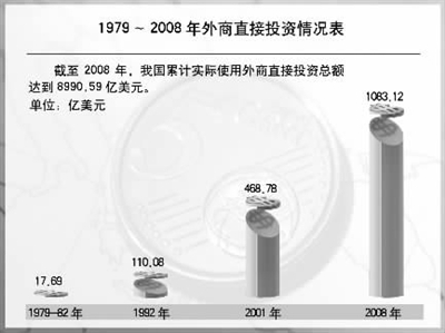 外商投资不仅带来了资金,更带来了先进的技术、管理经验和由此形成的综合竞争力,促进了社会生产力的发展和人民生活水平的提高。2008年,占全国企业数3%的外商投资企业创造了全国29.7%的工业产值、21%的税收、55.3%的出口,直接吸纳就业4500万人。目前,全球最大的500家跨国公司中,已有480余家在我国投资,外商在华设立研发中心约1200家,其技术外溢和示范效应有力促进了我国自主研发能力的提高。