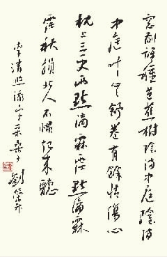 刘荣升勤于笔耕,孜孜追求高古的书风,在取法诸家的继承中历练。他习书初从唐颜、柳入手,以其奠定根基,立定法度;后上溯魏晋,以二王为宗,博求广取,形成了不激不厉、清淡雅致的特点。他写大字出名,但走笔行书,也别有一番韵致。既无剑拔弩张的狂怪之气,也无纤弱萎靡的娇弱之习,于平和淡雅之中,折射出中国传统文化思想的深邃内涵。