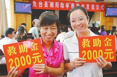 8月27日,家住鱼台县李阁镇董庄村、今年考入济宁学院的董永娜(左)和家住鱼台县唐马乡石庄村、今年考入泰山学院的张娣在鱼台县“朝阳助学”救助金发放仪式上领到救助金。