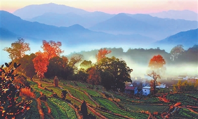 李白眼中的婺源秋天:“人烟寒橘柚,秋色老梧桐”。婺源之秋,天高云淡,稻浪滚滚,茶树瑟瑟;流水潺潺,村落老屋,炊烟袅袅。村民们忙得不可开交:忙着收稻谷,忙着犁地,忙着采菜……