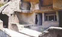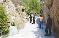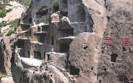 图二:峭壁上的洞穴有的上下相通,有的左右相连;洞内凿有石灯台、石灶台、石坑,布局合理;排烟道、气孔、户枢、门框痕迹历历在目。